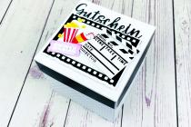 Material: Cardstock 250gsm in Weiß, Lineal, Bleistift, Flüssigkleber, doppelseitiges Klebeband, Schere oder Hebelschneider, Falzbrett und Falzbein, ggfs. einen 3D Embossingfolder eurer Wahl, Dekomaterial & Stanzen je nach Thema, hier "ATC Cinema Set 6 x 9" (Craft & You) sowie die Stanze "Filmklappe" (Joycrafts). Bühne und Sitzreihen sind von Mediendesign Moser.