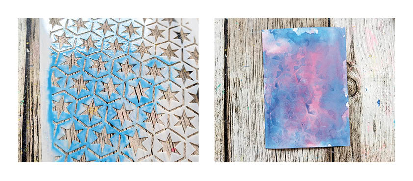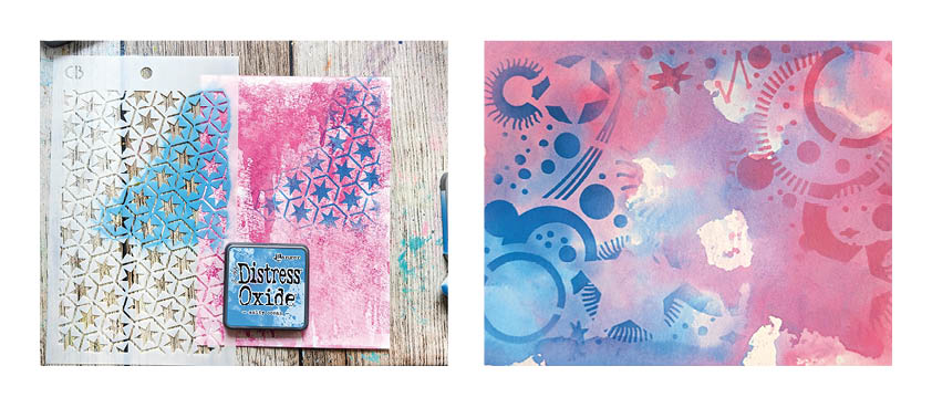 Viele von euch, kennen diese Technik bestimmt. Ihr könnt ganz leicht mit Schablone, Stempelkissen und Blending-Tool die Muster aufs Papier bringen. Dafür bietet sich nicht nur weißes Papier an, sondern Hintergründe, die ihr in den vorigen Schritten vorbereitet habt. Distress Oxide Inks können gut in Ebenen aufgetragen werden.