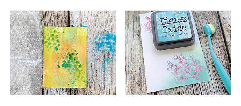 In flüssiger Form könnt ihr mit den Distress Oxide Inks ebenfalls stempeln. Dazu könnt ihr Luftpolsterfolie verwenden, alte Deckel, zerknüllte Frischhaltefolie oder andere Dinge aus dem Upcycling.