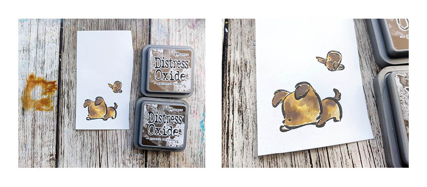 Mit den Distress Oxide Inks könnt ihr ganz normal stempeln - egal ob auf weißem Papier oder auf Farbe.