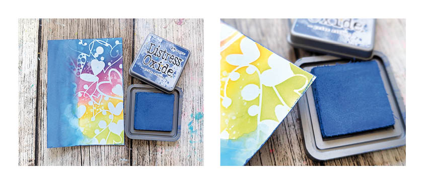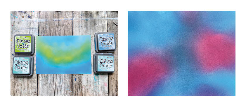 Distress Oxide Inks könnt ihr in unterschiedlichen Ebenen übereinander auftragen. Da sie opak sind (lichtundurchlässig) funktioniert das auch mit helleren Farben auf dunklem Hintergrund. Natürlich werden die Farben hier nicht so leuchtend, wie auf weißem Papier. Es ist dennoch einen Versuch wert.