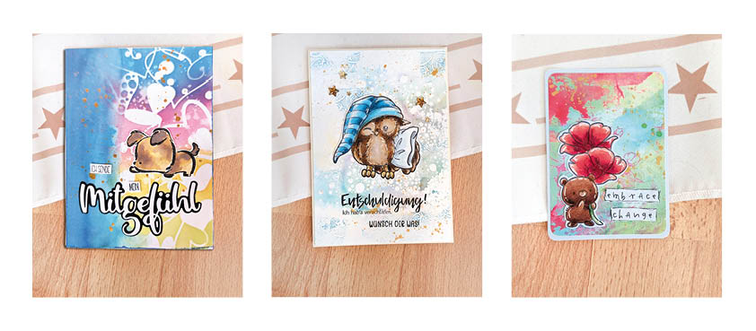 Zum Schluss zeigt euch Anke noch ein paar fertiggestellte Projekte, für die sie ihre gestalteten Hintergründe verwendet hat. Zusätzlich zu den Distress Oxide Inks hat sie noch mit diversen Pasten und goldener Acrylfarbe ein paar Highlights gesetzt.
