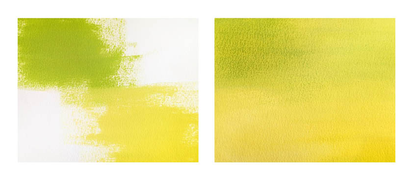 Diese Technik geht auch gut mit zwei Farben. Ist Farbe an eurer Walze übrig, könnt ihr diese mit Wasser besprühen und auf einem separaten Blatt abrollen. Das ergibt einen schönen Aquarelleffekt (rechtes Bild).