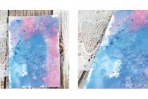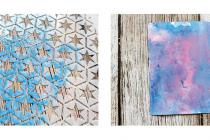 Um eure einfarbigen Hintergründe etwas aufzuhübschen, legt eine Schablone darauf und übersprüht beides mit Wasser. Lasst es kurz einwirken und tupft es mit einem trockenen Tuch ab. Hebt die Schablone vorsichtig ab. Nun solltet ihr eine hübsche Struktur erhalten, die das Motiv der Schablone andeutet. Das funktioniert am besten, wenn die Stempelfarbe im Untergrund nicht verdünnt, also recht viel Farbe zum Abnehmen vorhanden ist.