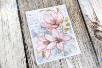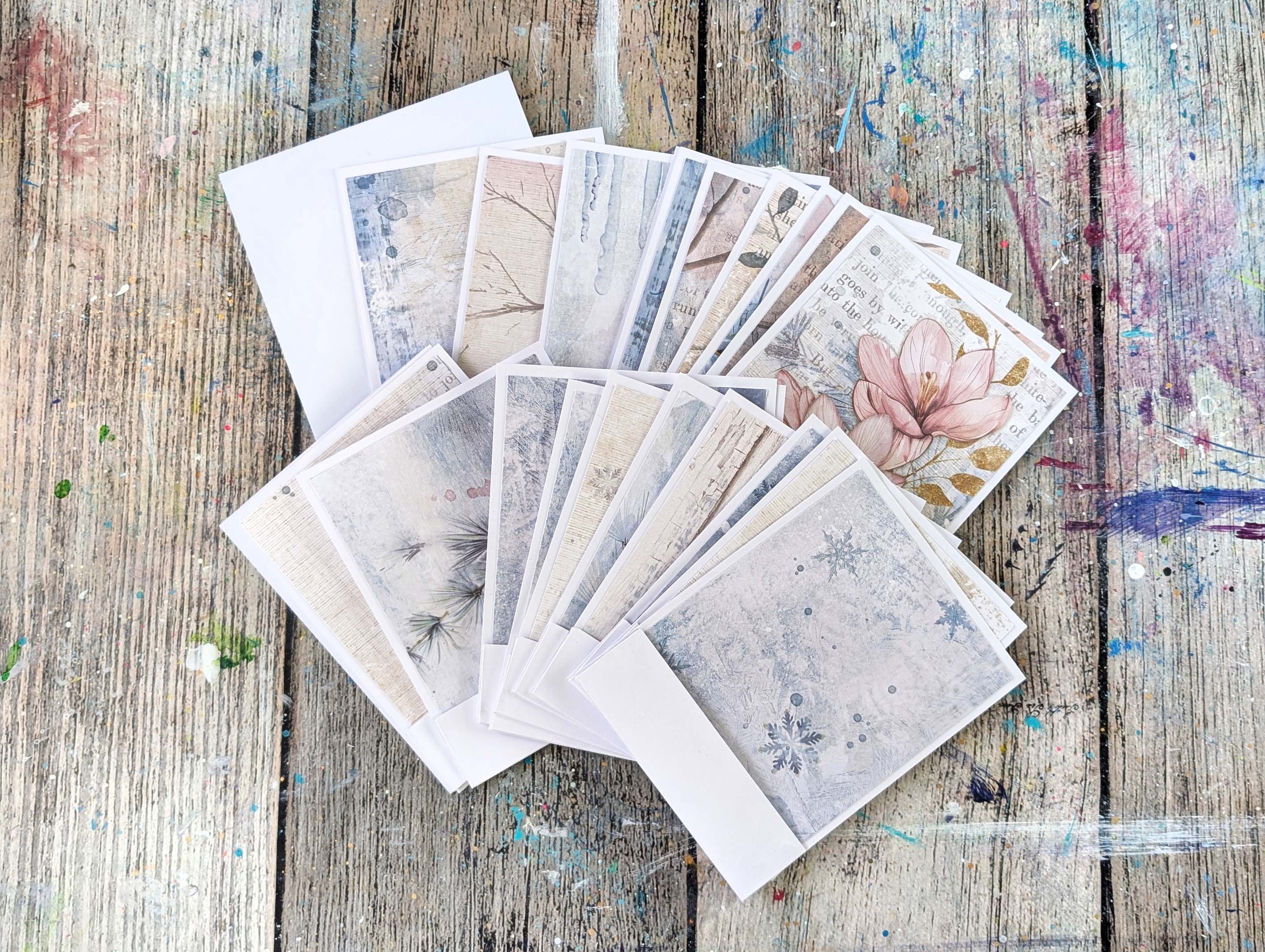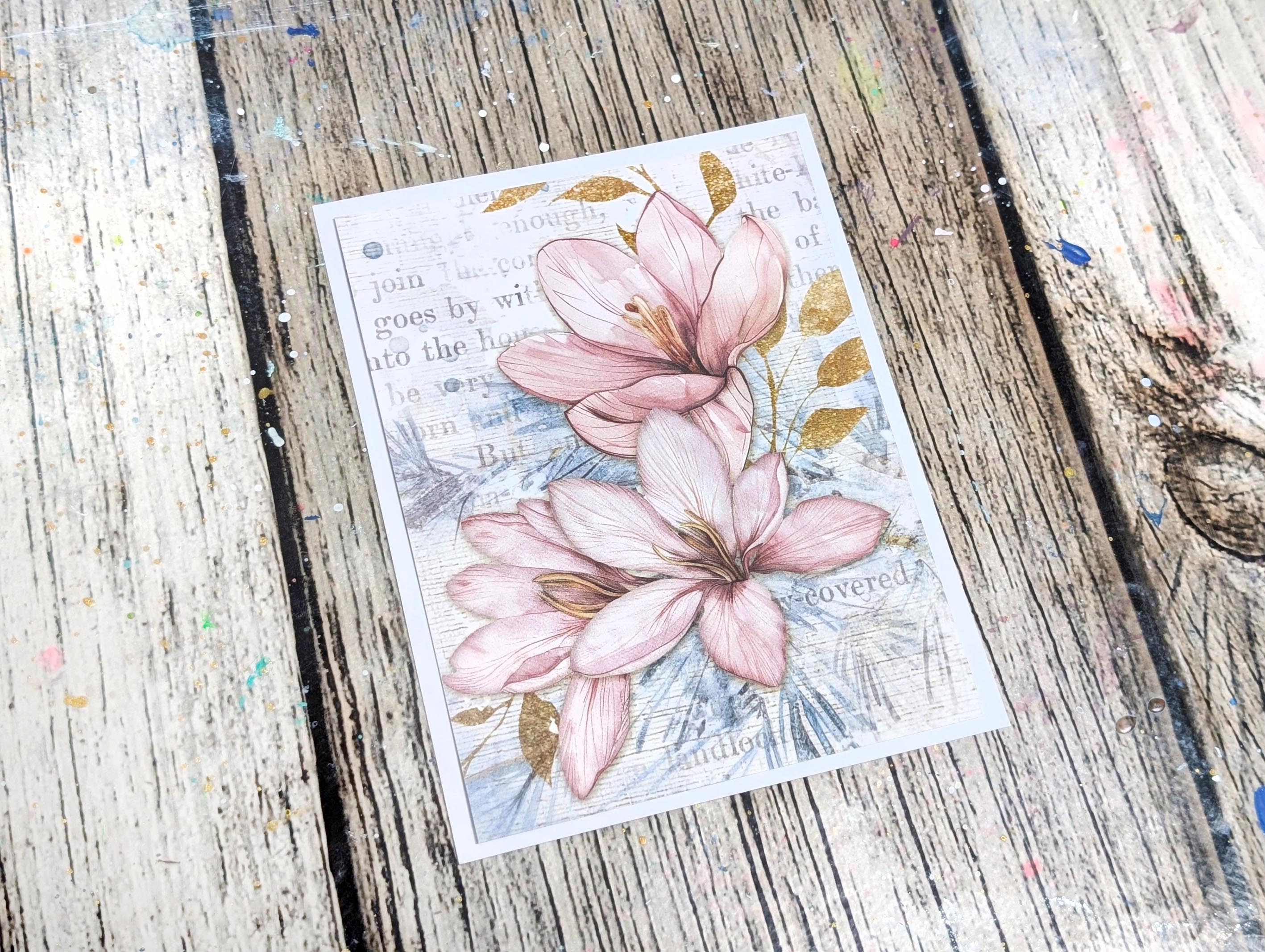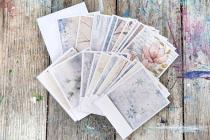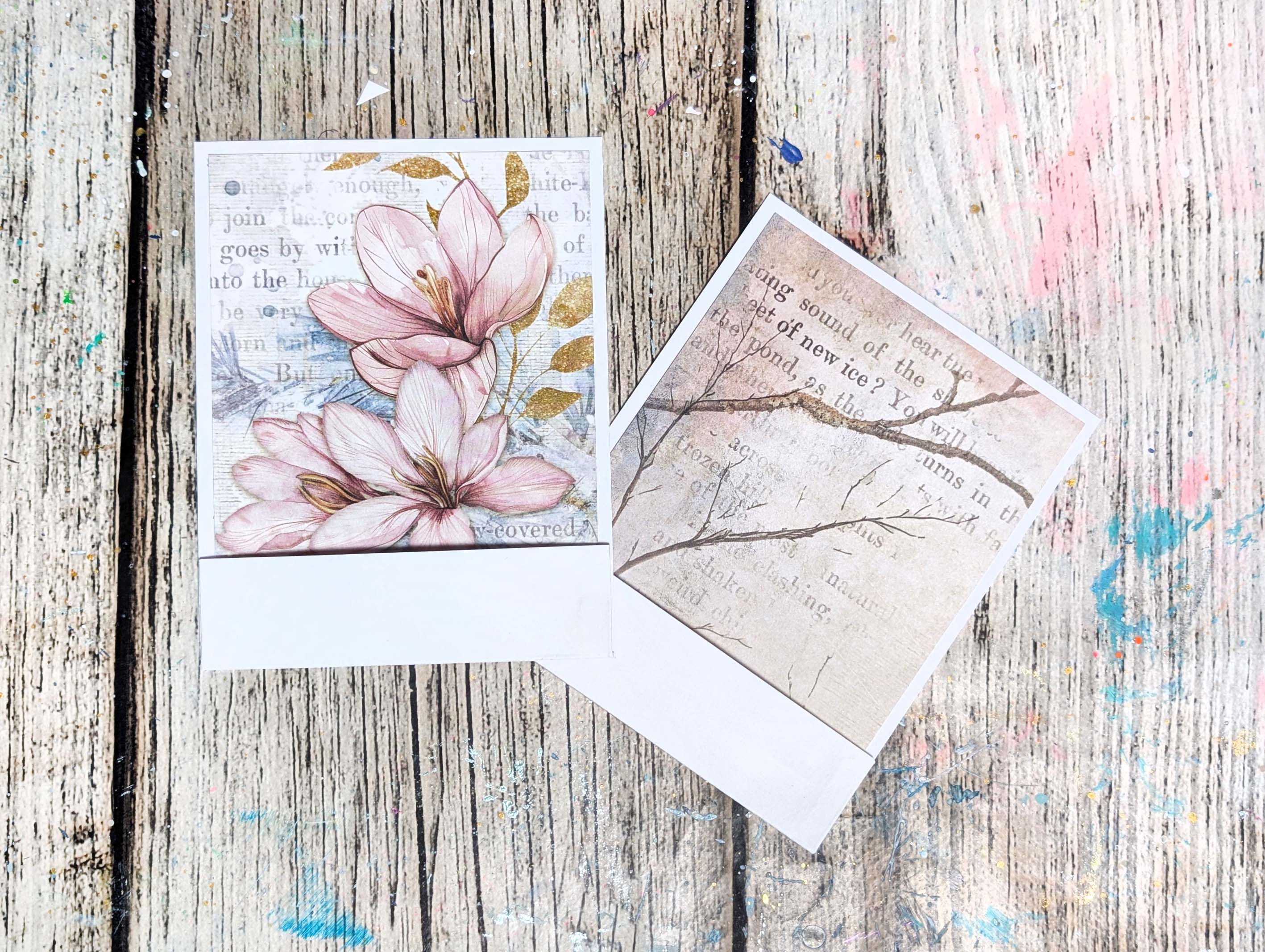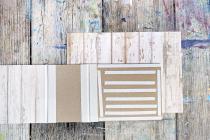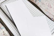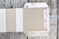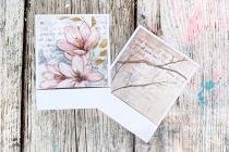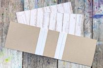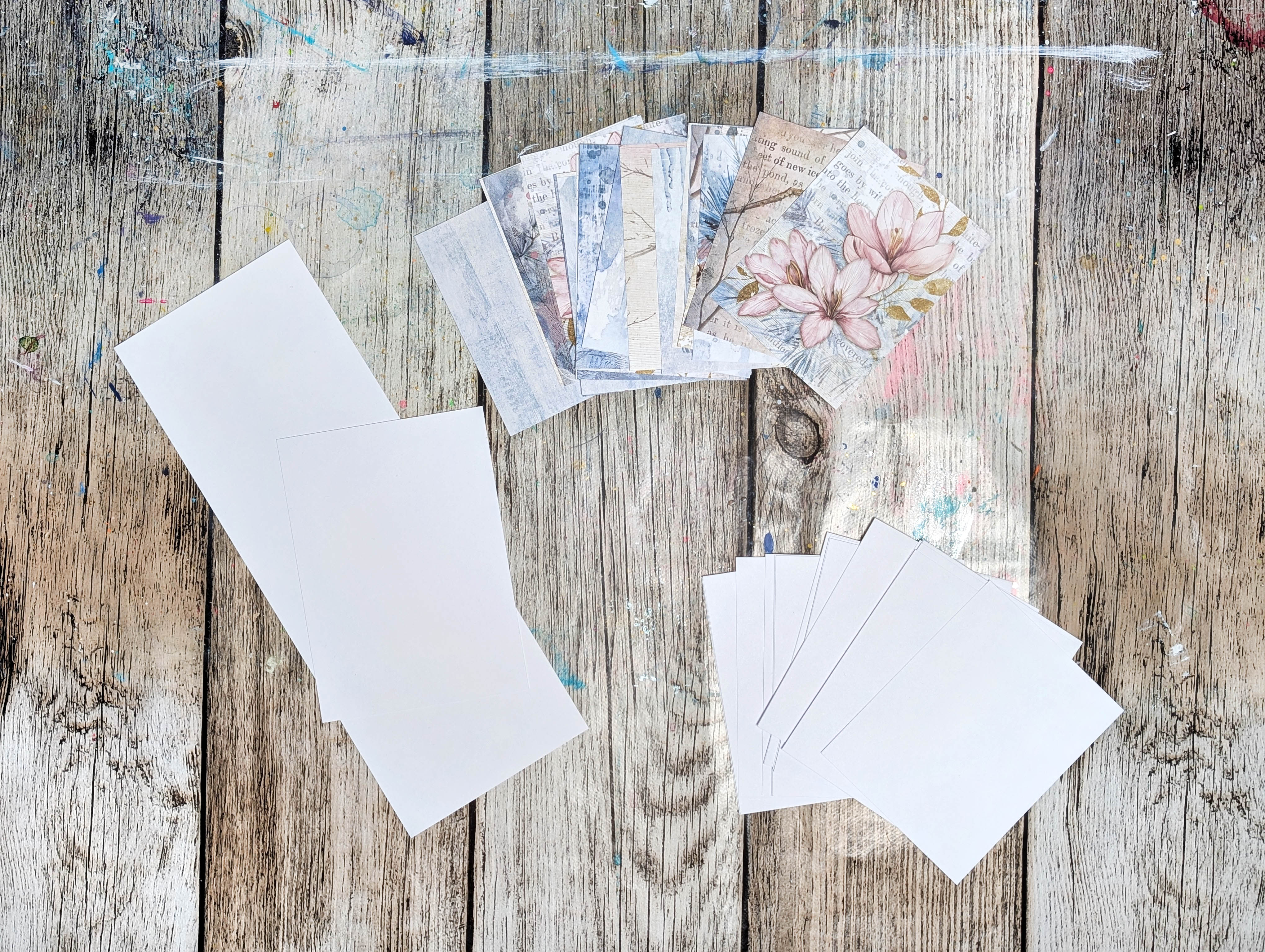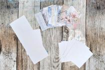 Schneidet euch alle Papiere zu. Anke hat sich hier für schlichten weißen Cardstock und den hübschen Papieren von Stamperia aus der Kollektion „Dew Drop“ entschieden. Diese sind winterlich, aber wirken durch die Blüten trotzdem warm und sind ganzjährlich verwendbar.