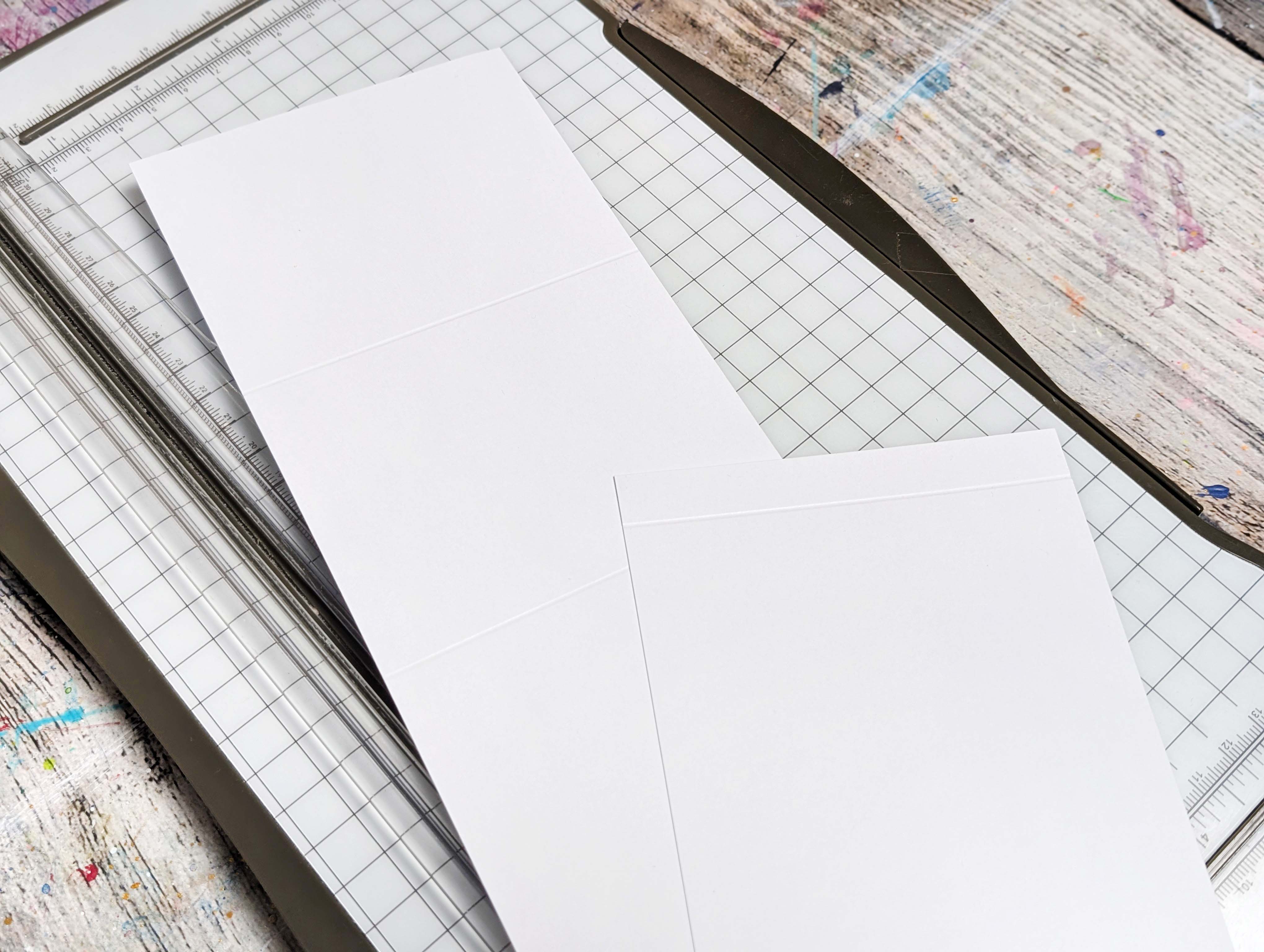 Als Erstes baut ihr den Ständer zusammen. Das große Stück Cardstock falzt ihr an der langen Seite bei 3 und bei 6 Inch, das kleine Stück an der langen Seite bei 5 Inch.