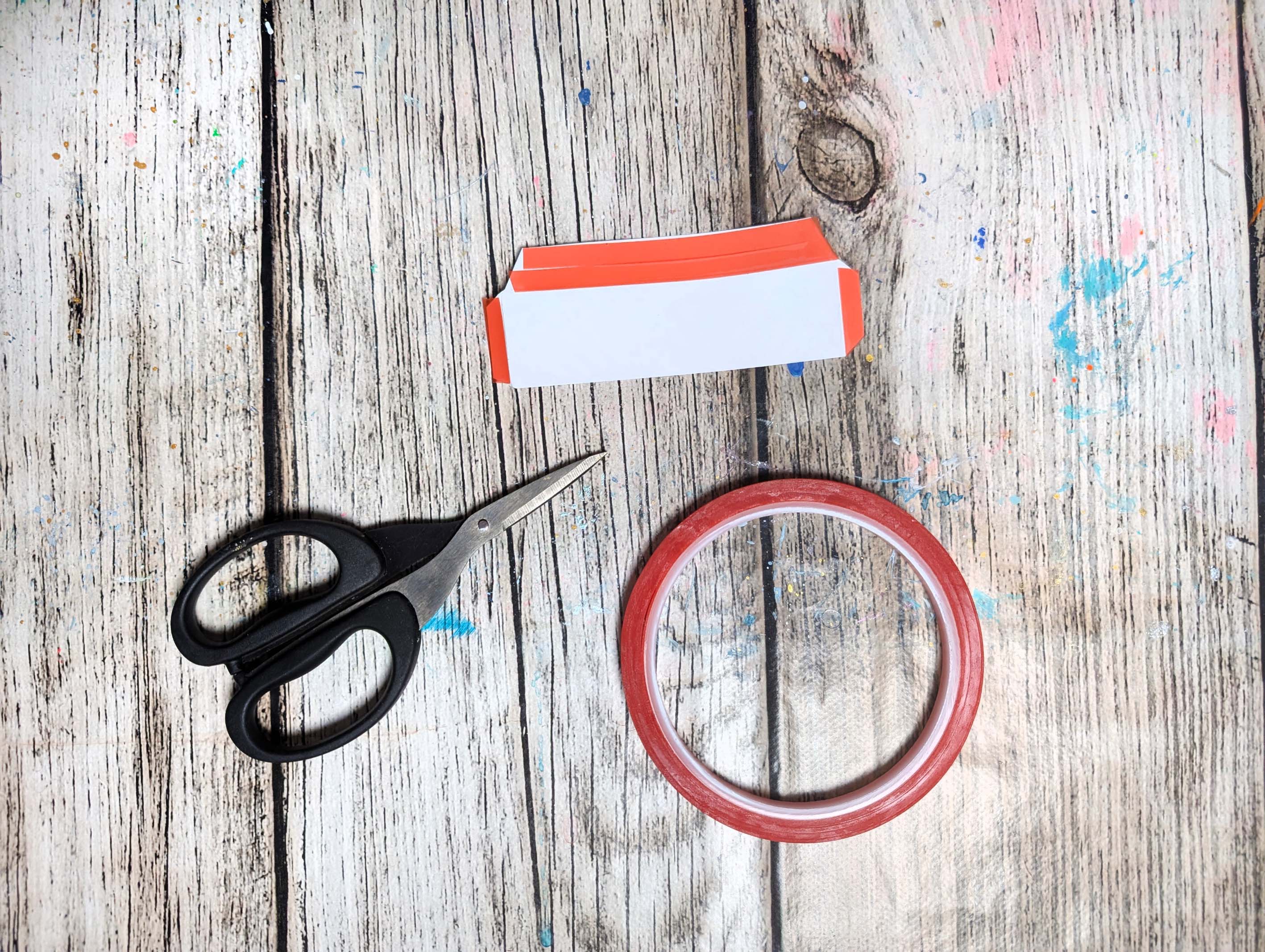 Fahrt die Falz mit einem Falzbein nach und gebt auf die Lasche des kleinen Cardstockstücks doppelseitiges Klebeband. Es sollte ein sehr starkes sein, damit euch der Ständer nicht auseinanderfällt.