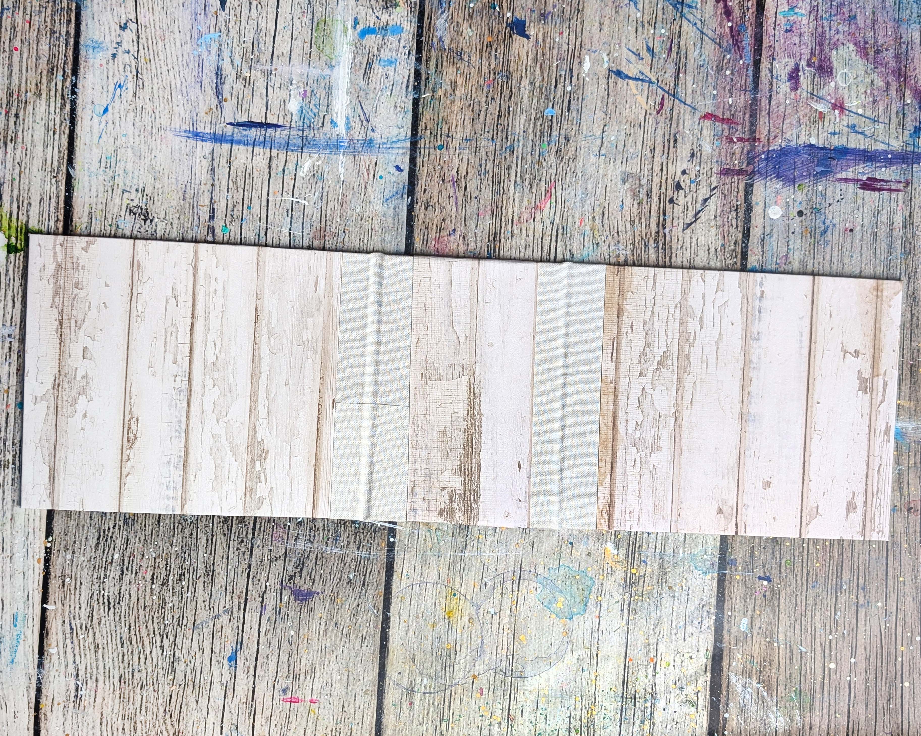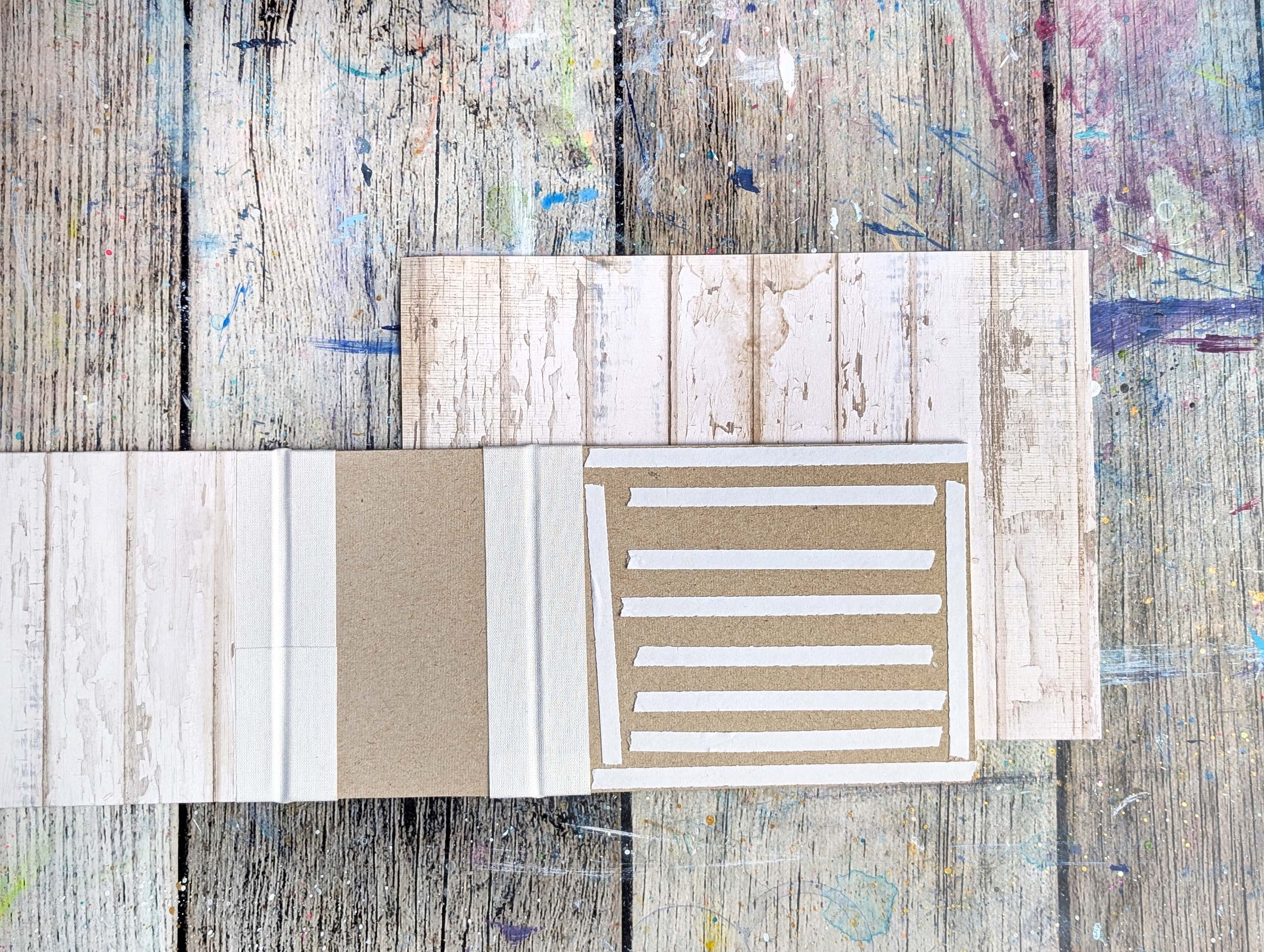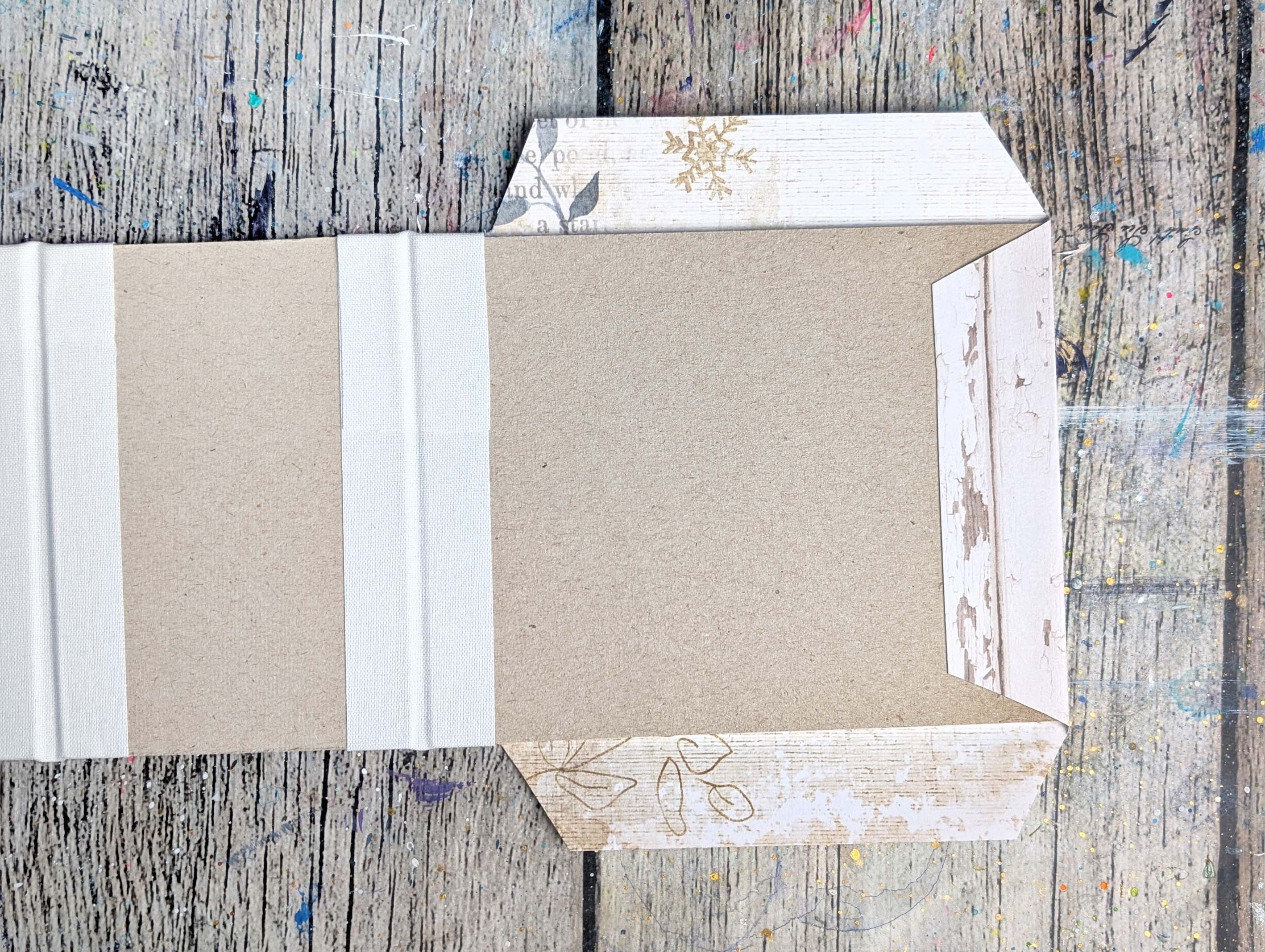 Für die Länge des Buchbindeleinens verwendet Anke die doppelte Höhe der Graupappe. Ein paar Millimeter rechnet sie dazu und wickelt den Leinen um die Rillen und fährt mit dem Falzbein noch mal darüber, um alles gut zu befestigen. Da das weiße Buchbindeleinen gut zum Designpapier passt, lässt Anke es stehen.