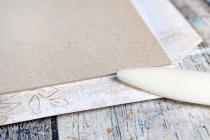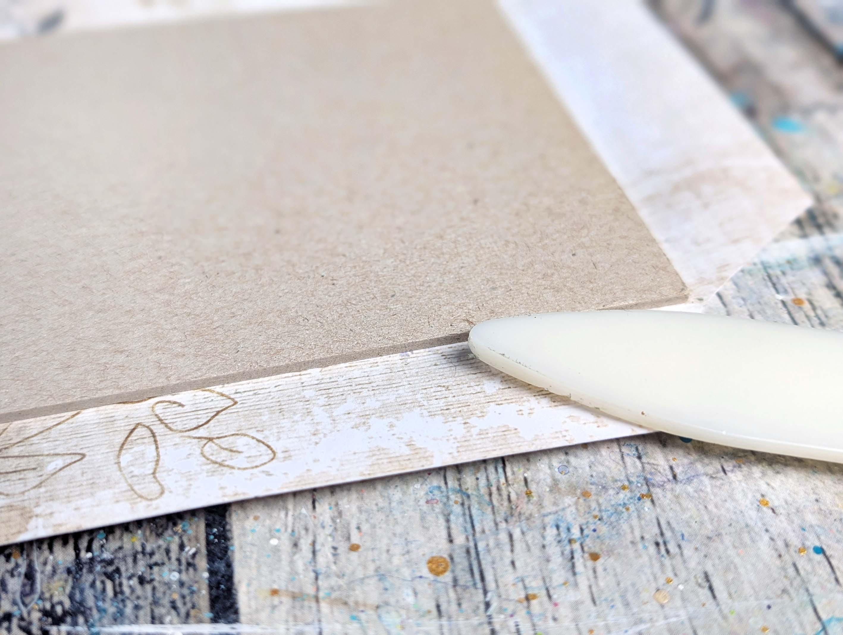 Dreht es nun auf die Seite mit dem Designpapier. Fahrt mit einem Falzbein an der Kante der Graupappe entlang, um die Fasern des Papiers etwas flexibler zu machen. So reißt beim Umschlagen nichts ein. Schrägt die Kanten auch hier ab, damit nichts übersteht.