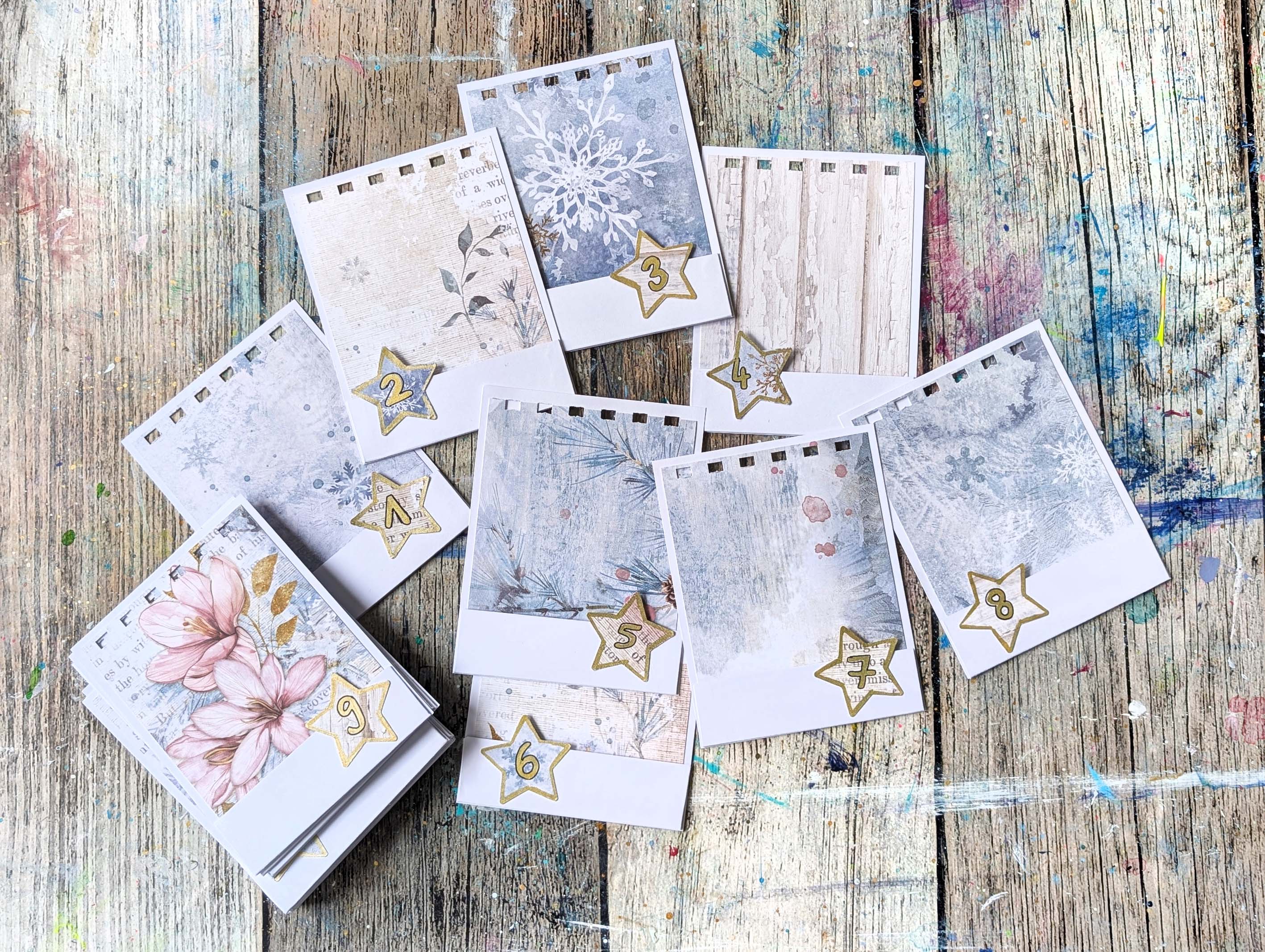 Ihr möchtet Gutscheine, kleine Erinnerungsfotos des vergangenen Jahres oder Teebeutel verschenken, dann ist diese Adventskalenderart etwas für euch. Für ihren Tischkalender hat sich Anke ATCs (Artist Trading Cards) gewählt, um jeden Tag bis Weihnachten einen motivierenden Spruch zu haben. Sie hat den Kalender nicht weihnachtlich gehalten, denn sie möchte ihn über das Jahr stehenlassen, die ATCs immer mal mischen oder austauschen. In diesem Beitrag stellt euch Anke das Grundgerüst vor.