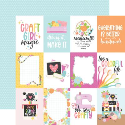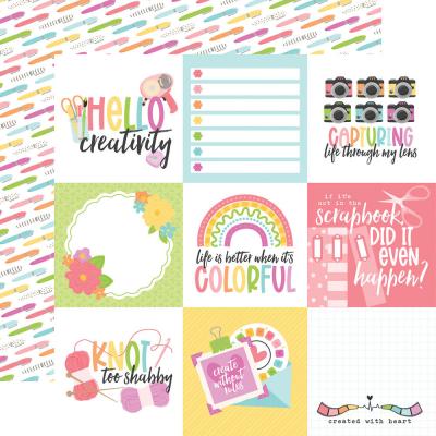 Knallig bunte Kollektion in den Tönen Pink, Hellblau, Hellgrün, Orange und Gelb, die wie Neonfarben wirken. Die Motive bieten alles, was ein gelungener Hobbyraum ausmacht: Kameras, Pinsel, Farben, Nähmaschine, Kleber, Stempel und alles, was ihr fürs Scrapbooking benötigt.