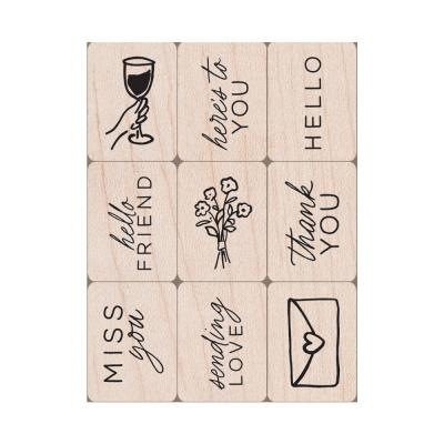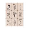 9 kleine Stempel, montiert auf Holzblöcken. Vielseitig ohne weitere Hilfsmittel einsetzbar.