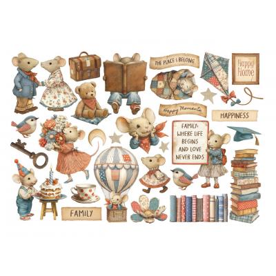 Wie der Titel der Kollektion schon sagt, dreht sich alles um das Thema Familie und Zuhause. Die Hauptrolle spielt eine süße Mäusefamilie. Alle Motive (wie Häuser, Interieur, Leckereien, Ballons und ganz viele Herzen) sind kunstvoll und heimelig gestaltet und sind in den Farben Rot, Beige und Blau gehalten.